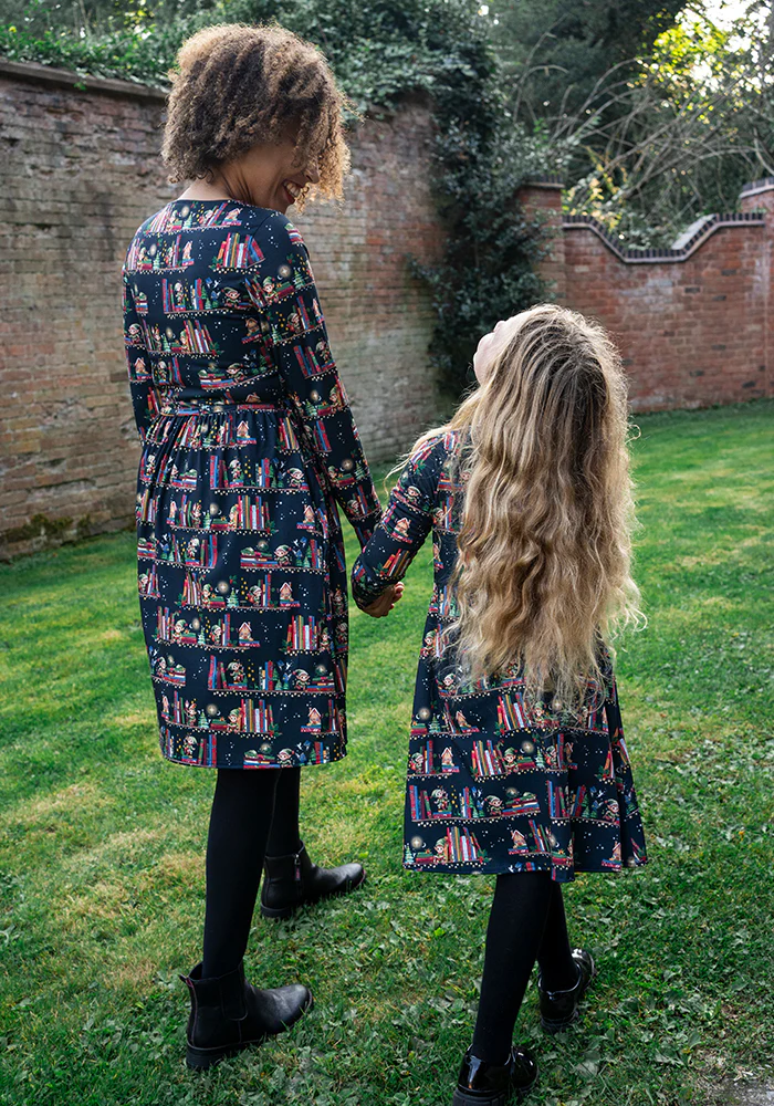 Our Christmas and Partywear collection is full of festive joy. From our base in Nuneaton we bring you this girl's dress which features elves reading on shelves and Christmas books. She will a great addition to your children's wardrobe. Easy to pull on an off style she is versatile and can be worn for everyday wear as well as parties. This busy mum will definitely be twinning with her girls. Happy Holidays!